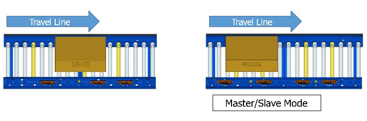 - A When setting in this mode, the zone has two motorized rollers to share the loading and the Master will command the logic of motion. On the Master/Slave mode, two BLDC Power Rollers share one sensor. Master/Slave mode must be under the same speed for balancing current and speed. .jpg)